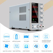 - High Precision Display: Three-window LED display for voltage, current, and power with optional four-digit accuracy (0.01V/0.001A).