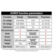 The ANENG A3005 Digital Multimeter Pen is a compact, pen-type digital instrument with 4000 counts for accurate and reliable measurements. This true RMS multimeter automatically identifies and measures DC/AC voltage, resistance, and continuity, eliminating the need for manual function selection. Its small size, large backlit LCD display, and convenient features like non-contact voltage detection and a flashlight make it an ideal tool for radio enthusiasts, professionals, and households.