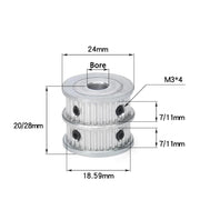 The 2GT Multiple Wheel Timing Pulley is expertly crafted from high-quality aluminum alloy with a galvanized iron edge, offering both durability and efficiency. Designed to deliver smooth and reliable power transmission in mechanical systems, this pulley features a 2mm tooth pitch and a 30-tooth configuration. Compatible with round bore sizes of 5mm and 6mm, it provides versatility with slot widths of 7mm and 11mm, making it suitable for timing belts with widths of 6mm and 10mm.