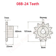 The 08B Industrial Drive Sprocket Wheel is built for reliable performance in various mechanical transmission systems. Made from high-quality 45# steel and treated with a blackened surface for corrosion resistance, this sprocket ensures durability and extended service life. Available in both 12 and 24 teeth configurations, it accommodates a wide range of keyway bore sizes for flexible installation.