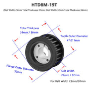 Keywords: HTD8M Timing Pulley, Keyless Bushing, 45# Steel, Transmission Component, 18 Teeth, 19 Teeth, 8mm Pitch, Slot Width 27mm, Slot Width 32mm.