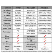9. Multiple Functions: Measures AC/DC voltage, current, resistance, capacitance, temperature, frequency, duty cycle, and more.