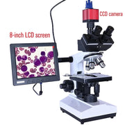 Microscopio trinocular HD biológico de laboratorio profesional con zoom 2500X + USB HDMI VGA CVBS cámara CCD digital electrónica + LCD de 8 pulgadas