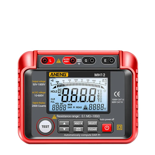Ver todos los detallesMH12 Digital Megohmmeter – Insulation Resistance Tester (50V/100V/250V/500V/1000V) with AC/DC Voltmeter, PI, Auto Discharge, Data Storage