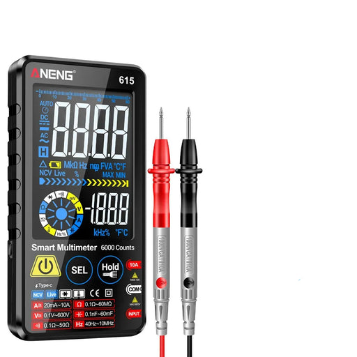 Ver todos los detalles615 Rechargeable Smart Digital Multimeter – 6000 Counts Touch Screen, AC/DC 600V, 10A, NCV, Frequency to 60MHz, Resistance 60MΩ, Capacitance 60mF, Temperature, CAT III 600V