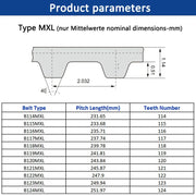 • Por ejemplo: B114 - 231,65 mm (Tipo=B114MXL; Longitud de paso=231,65 mm)