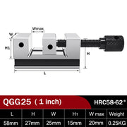 Product Description: The QGG Precision Flat-Nose Vise is crafted from high-quality Alloy Carbon Tool Steel, ensuring durability and a long service life. With an impressive accuracy of 0.005mm and a jaw hardness of HRC58-62°, this vise is perfect for precision grinding, milling, and cutting. Available in multiple sizes from 1 to 8 inches, it features a V-shaped cross design for increased clamping force and stability. The QGG Vise can be used upright or sideways, making it highly versatile for any workspace.