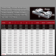 Product Description: The GT Precision Flat-Nose CNC Vise is designed for high-precision applications in milling and grinding. Made from durable Titanium Manganese Alloy Steel, this vise offers exceptional strength and stability. Available in models GT 4 inch (100mm), GT 5 inch (125mm), and GT 6 inch (150mm), it features an accuracy of 0.005mm with ISO9001/ISO9002 certification. With a carburizing and quenching treatment, this vise provides a high clamping force suitable for heavy-duty applications. It includes essential tools for easy setup, making it a reliable addition to any machining setup.