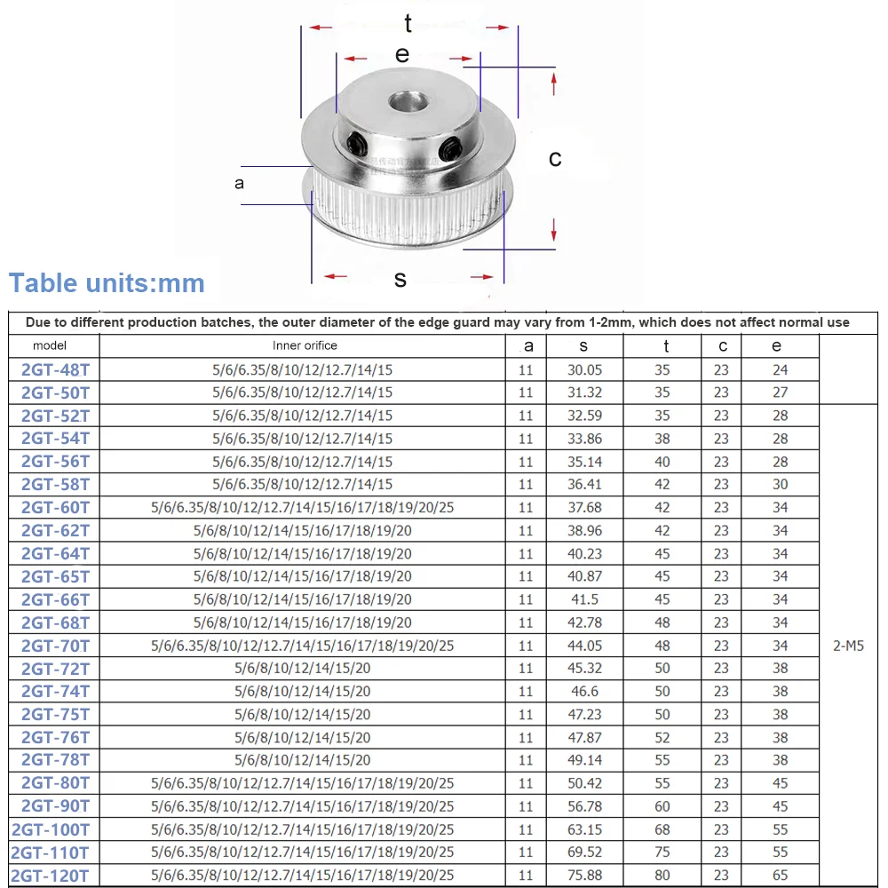 With a 2 mm tooth pitch (GT2 profile), this pulley is suitable for applications requiring accurate positioning and smooth motion. The multiple tooth count options (40T to 48T) allow flexibility in gear ratio selection for different mechanical setups.