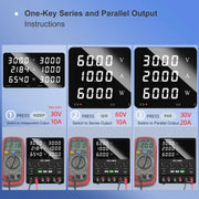 • Independent Dual-Channel Functionality: Constant voltage and current automatic conversion, with adjustable channels operating independently or in series/parallel modes.