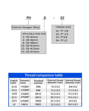 The PH Series Pneumatic Elbow Fitting is a 90-degree right angle push-in connector designed for compact pneumatic installations. The outer hexagon design allows easy tightening and secure installation.
