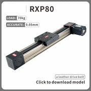 Description: The RXP80 Precision Linear Guide with Electric Slide is engineered for high-precision, high-load applications. With an 80mm wide guide rail, this actuator supports horizontal loads up to 60kg and vertical loads up to 30kg. It features a synchronous belt drive with customizable stroke lengths ranging from 100mm to 6000mm. The RXP80 is compatible with 57/56 stepper motors and a 400W servo motor, offering maximum speeds of 500mm/s, making it suitable for heavy-duty CNC machinery, automation, and industrial applications.